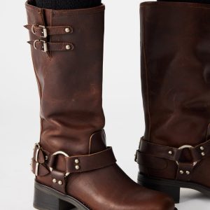boot features a slouchy mid-calf silhouette reinforced with strap accents and substantial buckle hardware. A wide sole with a block heel provides a solid foundation for this engineer-inspired design.