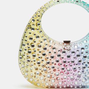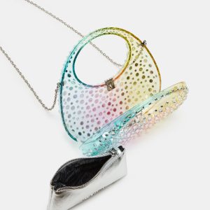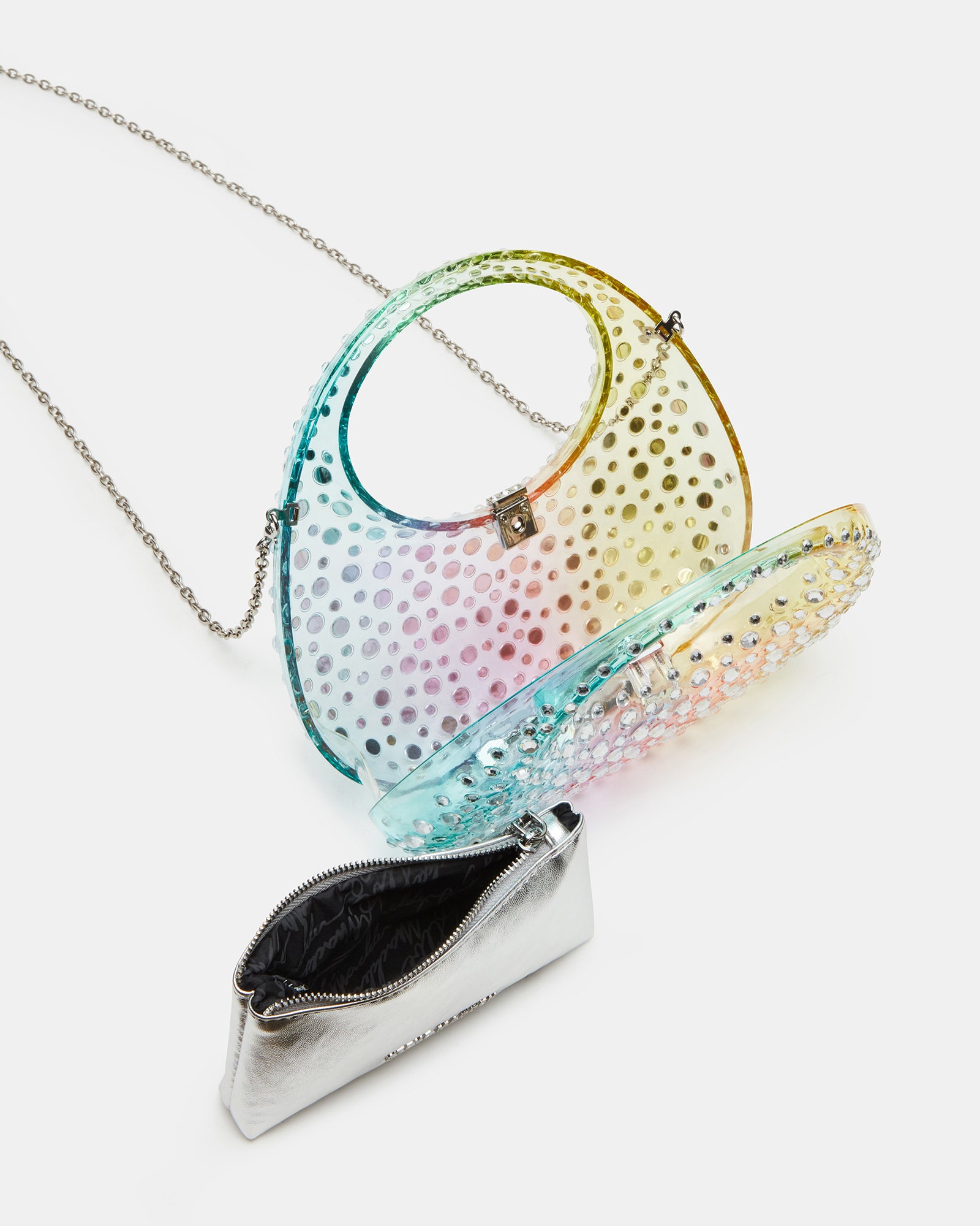 The DAZY bag is a structured clear shoulder bag with elegant rhinestone embellishments. It features a clutch snap closure for easy access and a removable, adjustable chain crossbody strap for versatile wearing options. Additionally, it comes with a convenient zipper closure pouch. Elevate your style with this glamorous and functional bag.