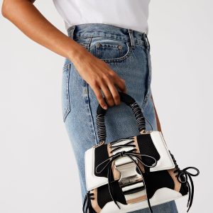 The DIEGO bag is a structured trapezoid bag with athletic-inspired details like mesh overlay panels, sneaker style lacing, and an oversized quick release buckle closure.