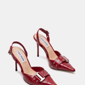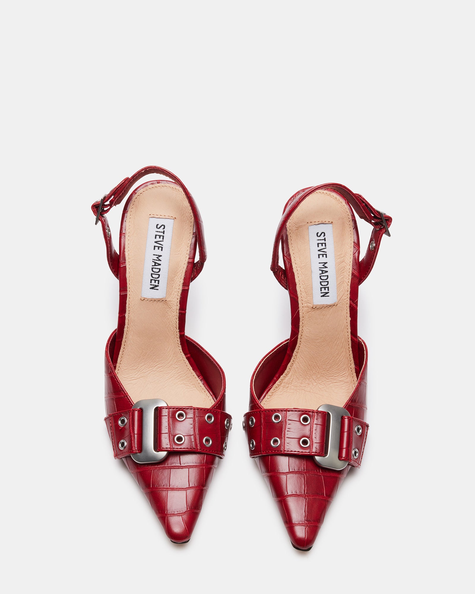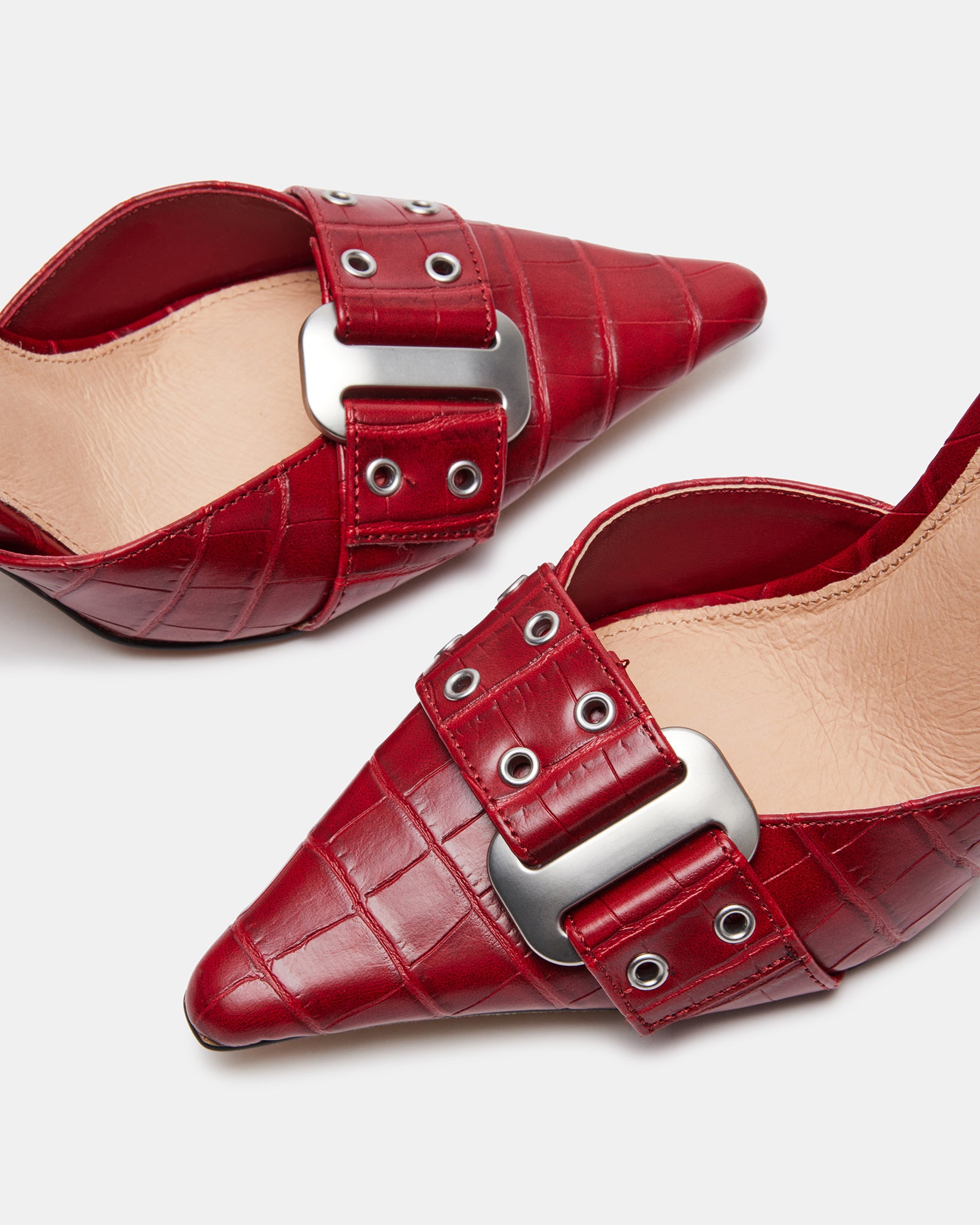 The DILLON pump features a point toe stiletto silhouette accented with chunky buckle hardware.
