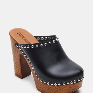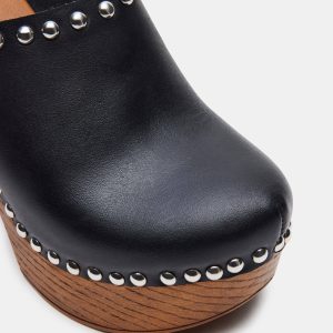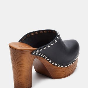 Elevate your style with the DUTCHESS platform mule heel. Featuring a wooden bottom and clog design, this shoe will add a unique touch to any outfit. The studded details add a subtle edge. Walk confidently with the sturdy platform and enjoy the added height and comfort.