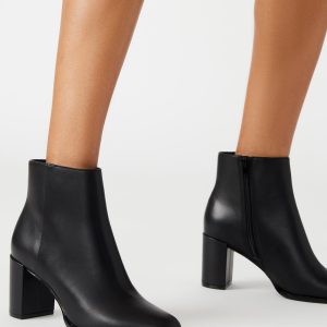 bootie is a cropped ankle height design with a sleek upper set on a matched block heel for an understated monochrome look.
