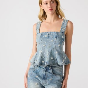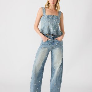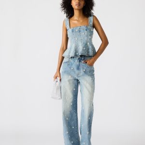 Upgrade your wardrobe with our PENELOPI denim tank top. Made with high-quality denim, this tank top features elegant pearl and floral embellishments, adding a touch of sophistication to your outfit. Complete your look with the matching set for a stylish and coordinated ensemble. Elevate your fashion game with this must-have piece.