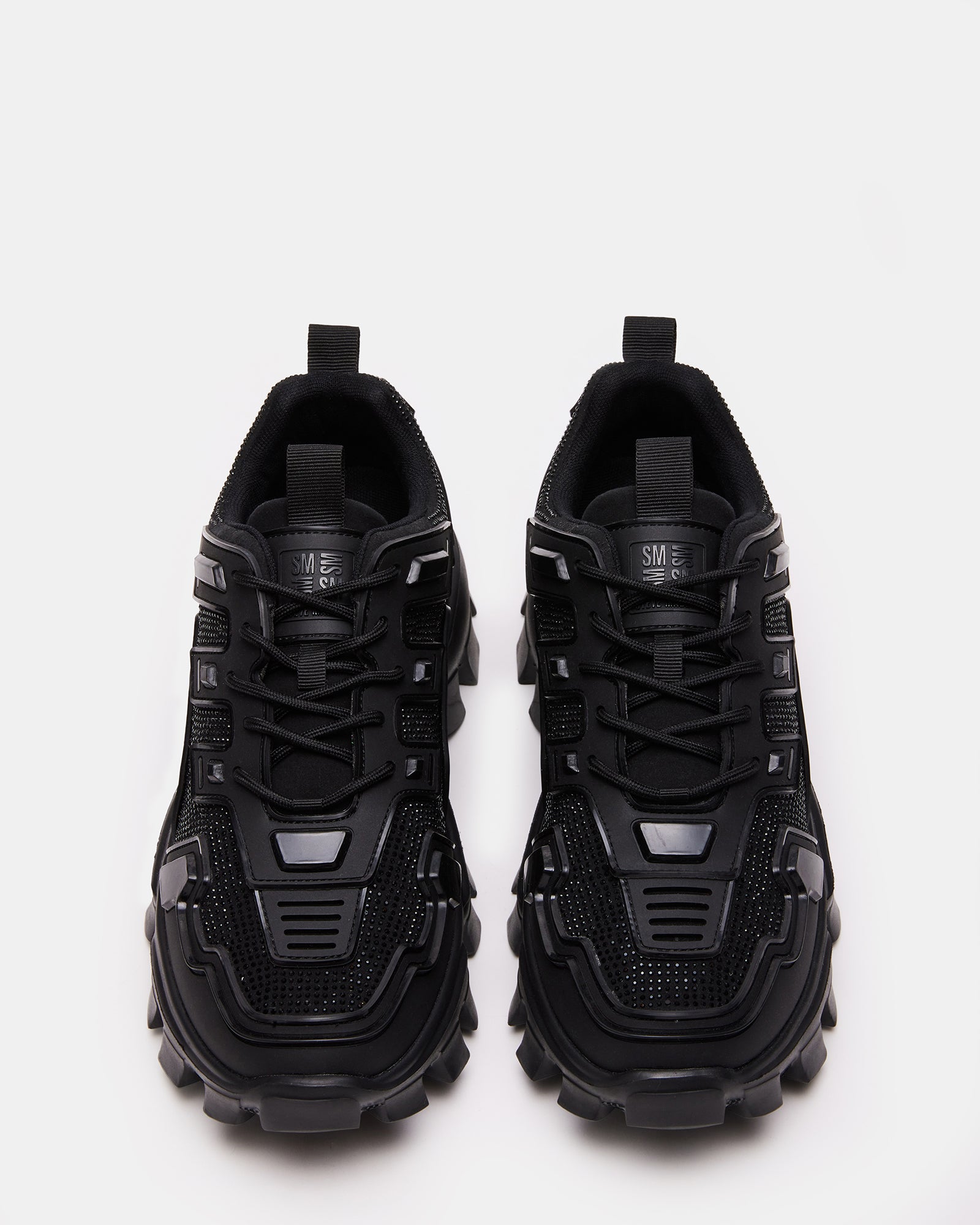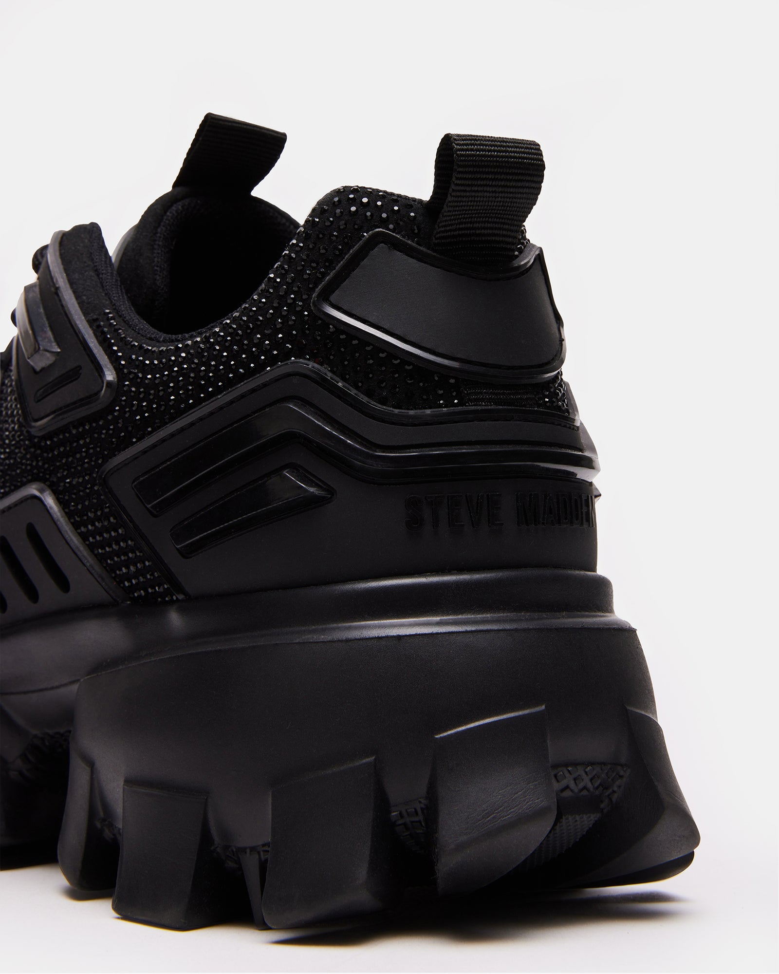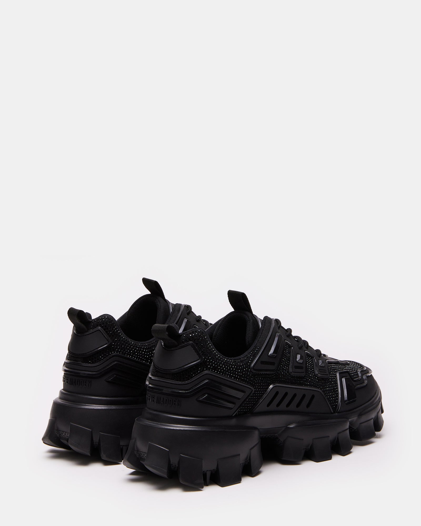 sneaker matches the exaggerated molded sole with a detailed upper reinforced with angular textured accents.